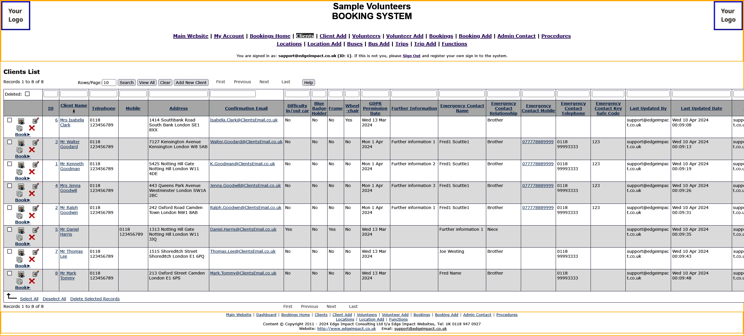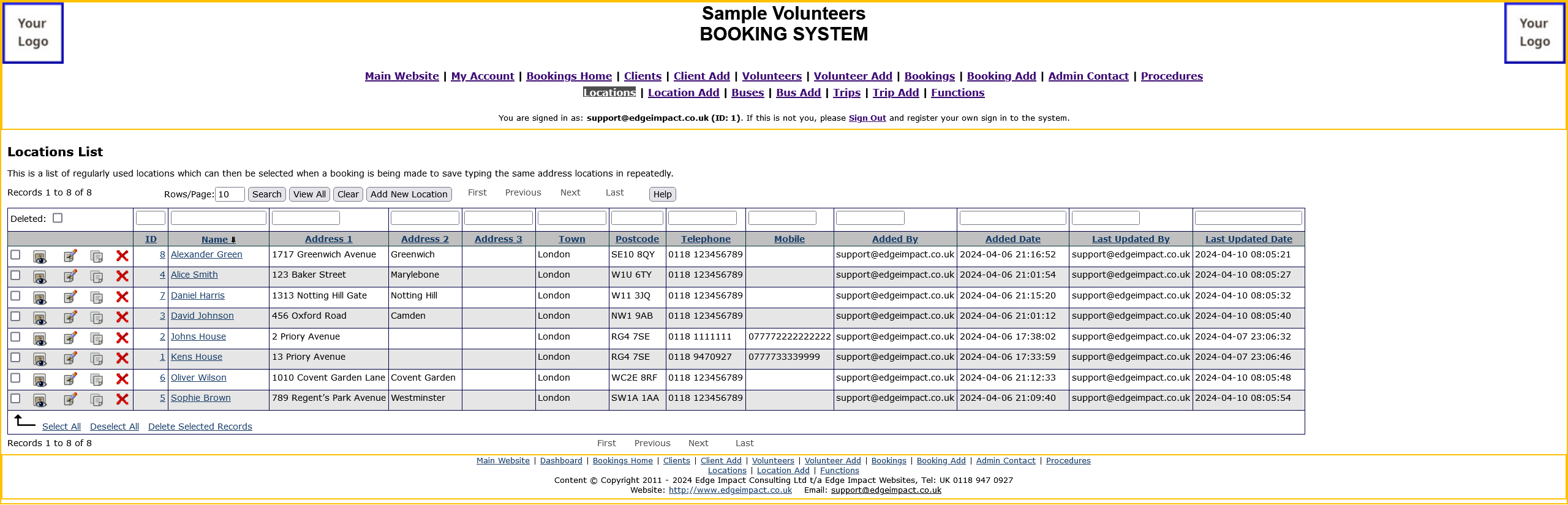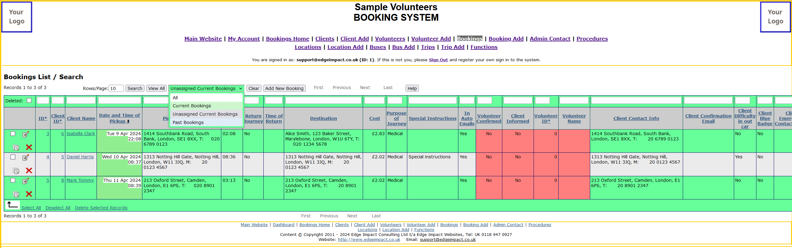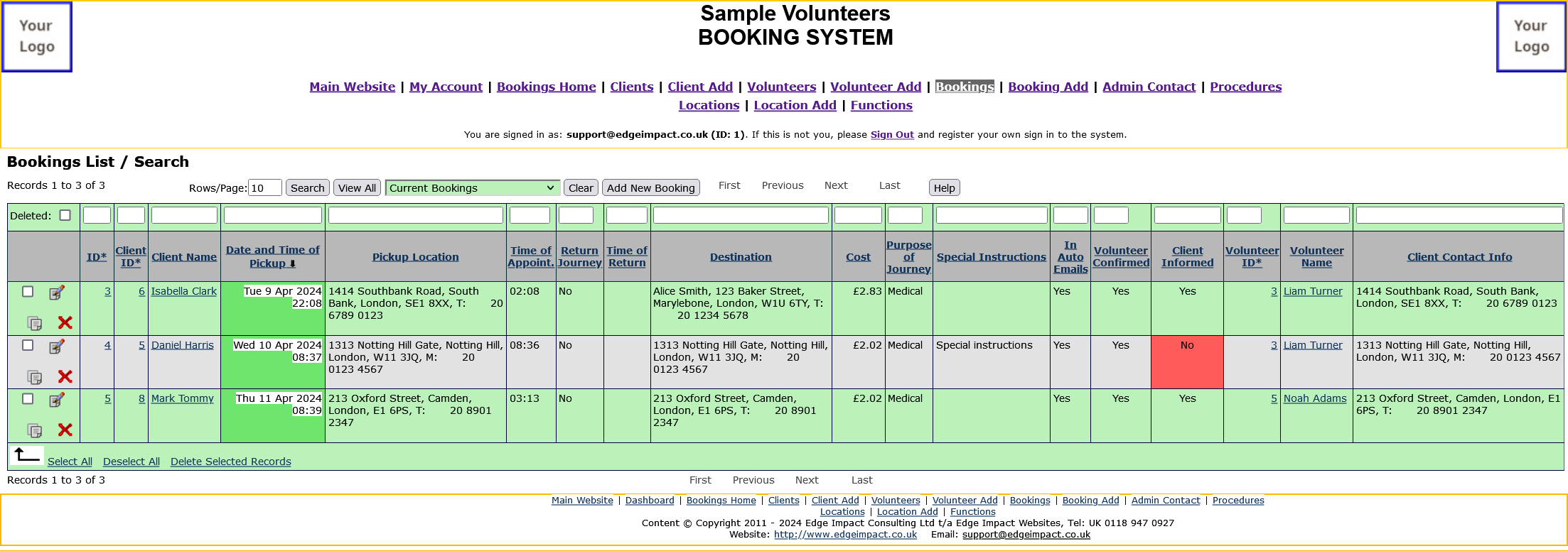 Confirmation details are sent to Volunteers together with directions Google map links. Clients, Volunteers and commonly used destinations in a Locations table can be added and selected for bookings at the click of a button. Emails are sent out daily to volunteers telling them how many available unassigned bookings are available and they can accept them themselves, saving the office workers a lot of time.