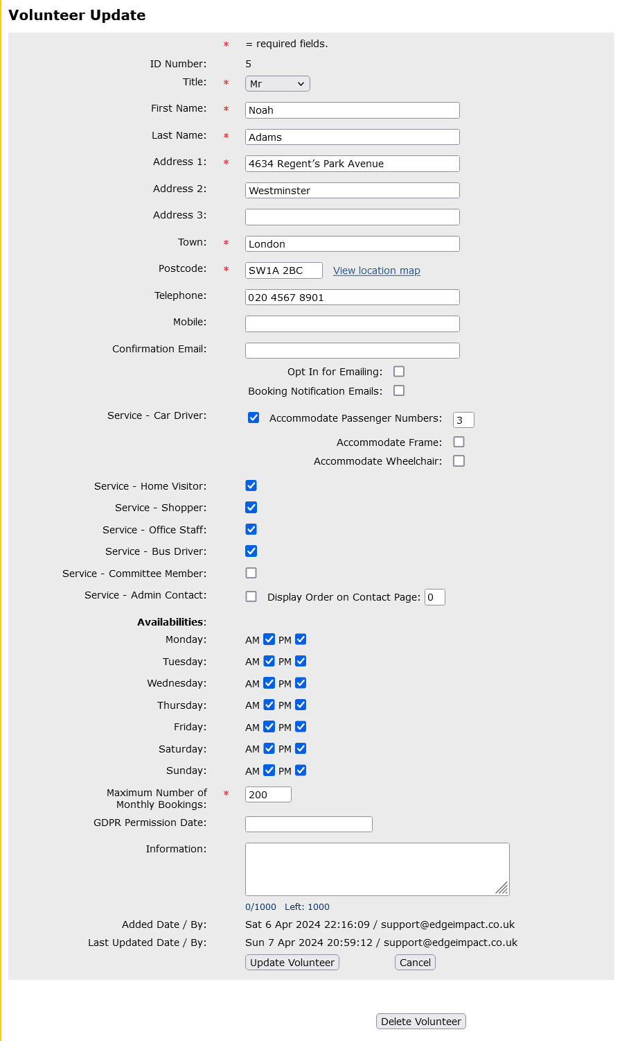 Volunteer records allow you to specify the days and times that they are available, the type of bookings that they can fulfil plus other important criteria associated with their availability.